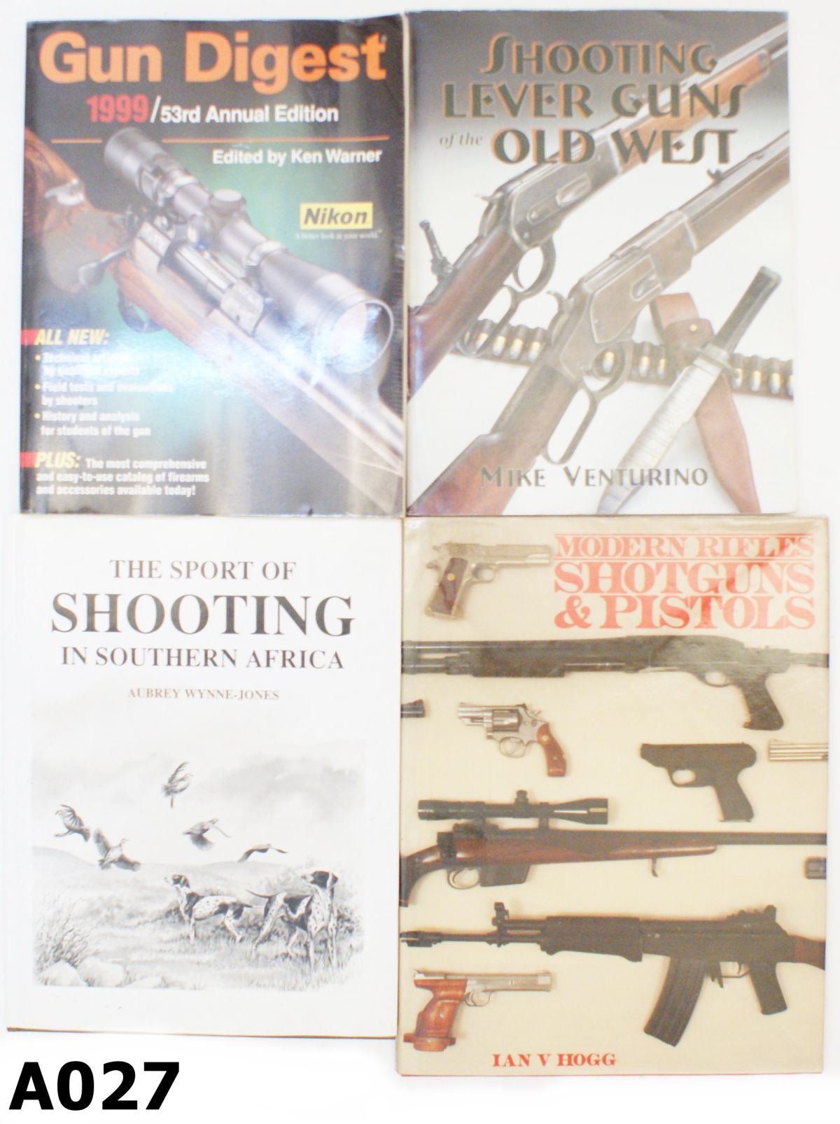 1) Modern Rifles Shotguns & Pistols by Ian V Hogg. Hard cover. illustrated.112 pages. Good plus condition. 2) The Sport Of Shooting In Southern Africa by Aubrey Wynne-Jones. Hard cover. illustrated. 198 pages. Good condition. 3) Shooting Lever Guns Of The Old West by Mike Venturino. Soft cover .illustrated. 300 pages. Good condition. 4) Gun Digest 1999 53rd Annual Edition edited by Ken Warner. Soft Cover. illustrated. 542 pages. Fair condition.