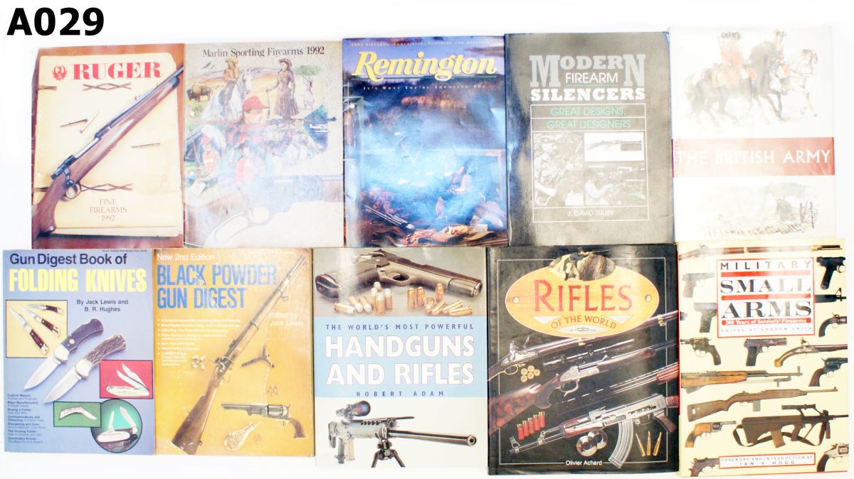 1) Ruger Firearms 1992. Softcover. illustrated. 33 pages. Good condition. 2) Marlin Sporting Firearm 1992. Softcover. illustrated. 23 pages. Good condition. 3) Remington. Softcover. illustrated. 67 pages. Good condition. 4) Gun Digest Book of Folding Knives by Jack Lewis and B.R. Hughes. Softcover. illustrated. 288 pages. Good condition. 5) New 2nd Edition Black Powder Gun Digest edited by Jack Lewis. Softcover. illustrated. 288 pages. Cover has a rip in it. Fair condition. 6) The World’s Most Powerful Handgun and Rifles by Robert Adam. Hardcover. illustrated. 128 pages. Excellent condition. 7) Rifles of the World by Olivier Archard. Hardcover. illustrated. 141 pages. Good condition. 8) Military Small Arms edited by Graham Smith. Hardcover. illustrated. 240 pages. Excellent condition. 9) Modern Firearm Silencers by J. David Truby. Softcover. illustrated. 107 pages. Good condition. 10) The British Army by Oxford. Hardcover. illustrated. 47 pages. Good condition.
