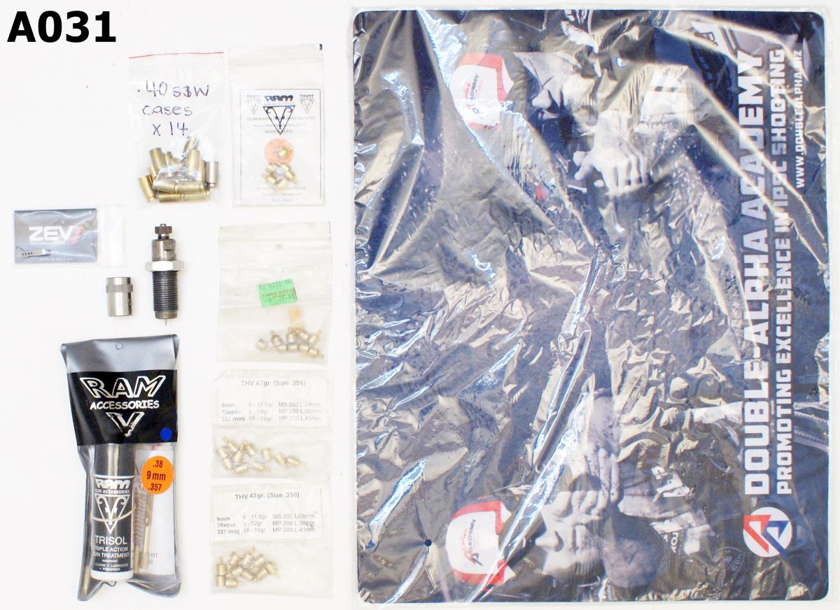 RAM 9mm cleaning kit-new. 35 x THV machined brass 9mm bullets. .45acp case length gauge. Zev Tech V5 Glock connector. .40s&w Lee decapping die & Double Alpha bench mat-new..