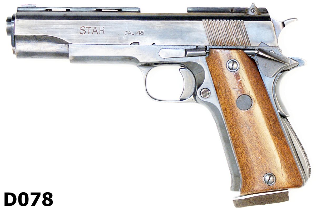 A full-size Spanish made variant of the Colt Govt. Model with smooth wooden grips and a ventilated rib to the slide and windage adjustable rear sight. Manufactured post WW 2 and equipped with a 5 barrel and seven round magazine. The Model P saw widespread service with both the Spanish and West German police forces. Good original condition.