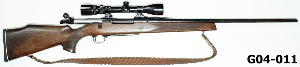 Equipped with Bushnell 3-9X Banner scope. Barrel length of 26″ (660mm), short throw 60 degree fluted bolt, hinged floorplate with detachable box magazine, top-tang sliding safety and grooved adjustable trigger. Monte-carllo styled stock 4-panel chequering. First introduced in 1985. Good to good plus condition.