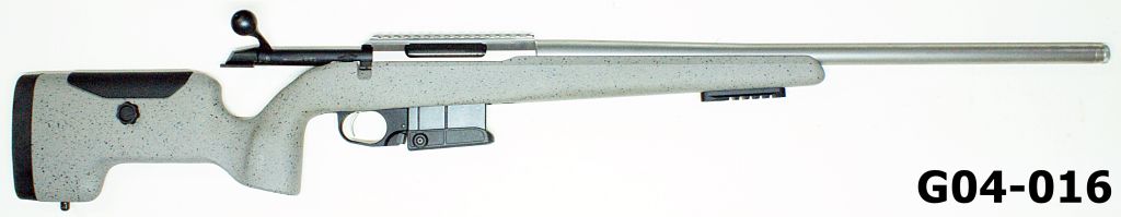 Muzzle of 24″ (609mm) barrel threaded for suppressor, action is fitted with a tactical rail. Extended box magazine. Adustable grey synthetic stock with tactical mount below barrel. Excellent condition.