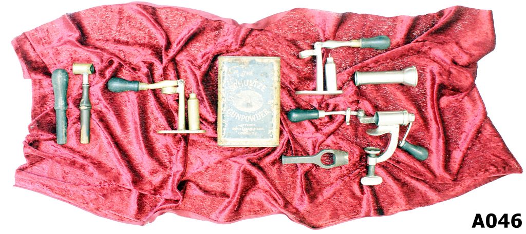 Includes: Nickel plated powder funnel by Hawksley, 3/4 steel wadcutter, ebony wad seater, adjustable powder measure, nickel plated roll-crimping tool, two priming/depriming tools and a tin marked The Schultze Gunpowder’. All in fair to good condition