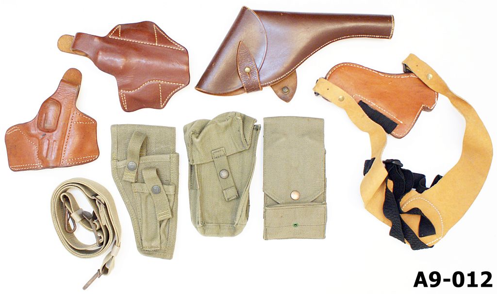 Webbing: Patrol bag strap. 2 x FN/R1 magazine pouches. pistol holster; Various leather holsters x 4.