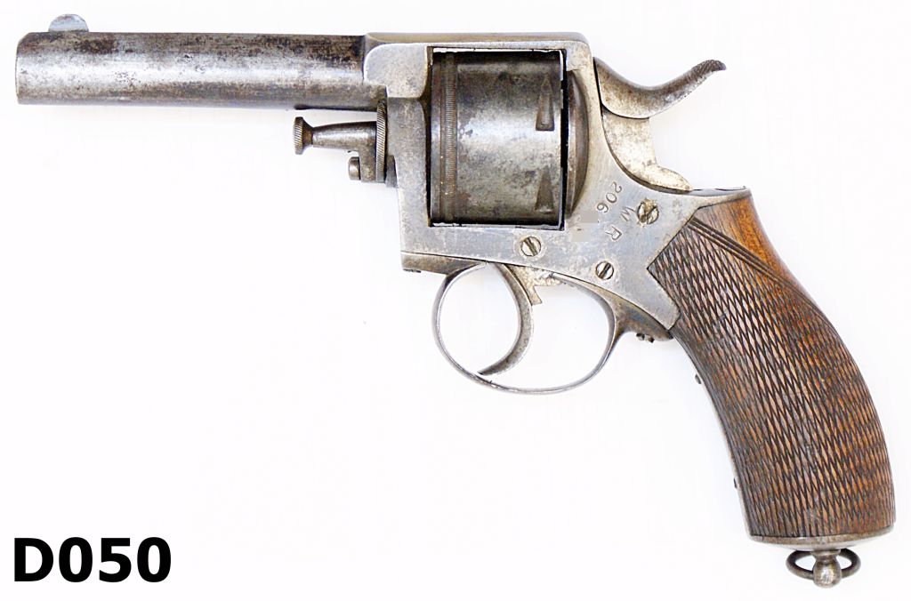 A solid frame double action revolver built on the Webley R.I.C lines. Chequered wooden one-piece grips. 4 barrel length. under-barrel ejector. lanyard ring to butt. Barrel is marked to Westley Richards & Co.