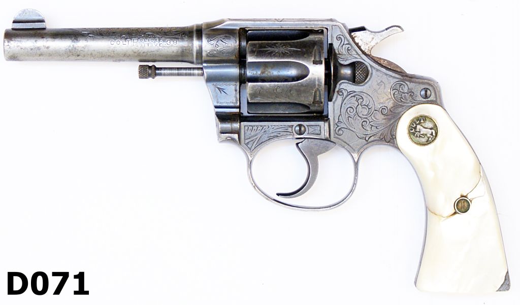 Mother of pearl grips. decorative engraved features throughout including barrel . frame and cylinder. Made 1905 to 1947. Left hand grip has a crack to it and bottom of grip is chipped. Good original condition with a fair percentage of original blued finish remaining.
