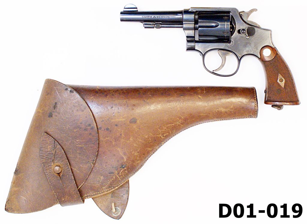 Includes issue leather holster. Chequered wooden grips with factory logo . Part of the batch of revolvers ordered by the UDF at the commencement of WW2.