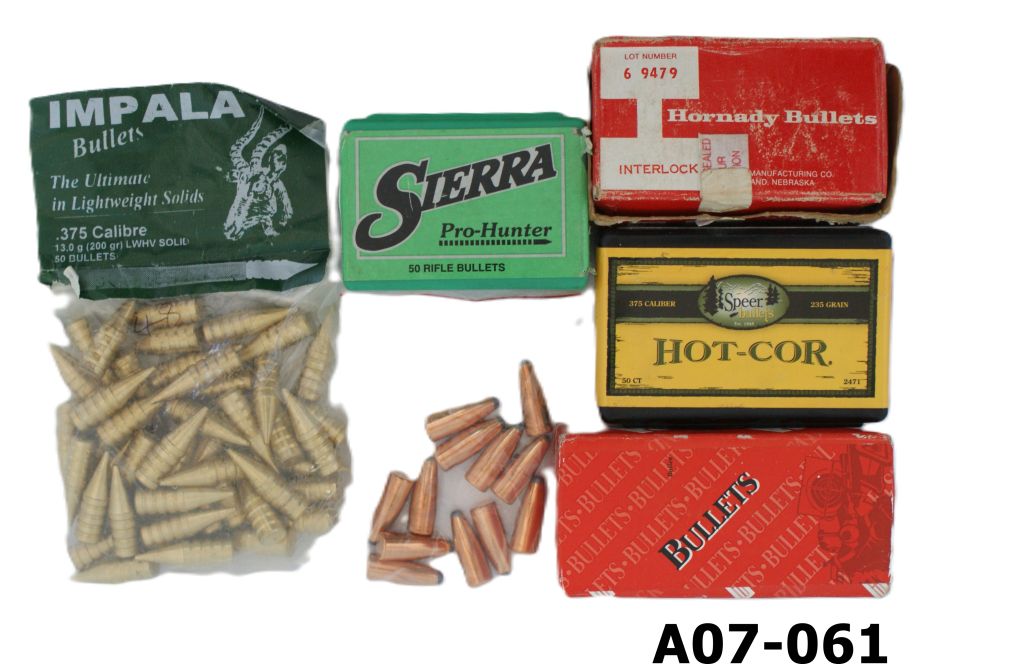 1) Impala 200gr LVHV brass x 48. 2) Speer 235gr HCSP x 29. 3) Hornady 270gr RNSP x 31. 4) Hornady 270gr. RN x 50. 5) Sierra 200gr FN Power Jacket x 38.