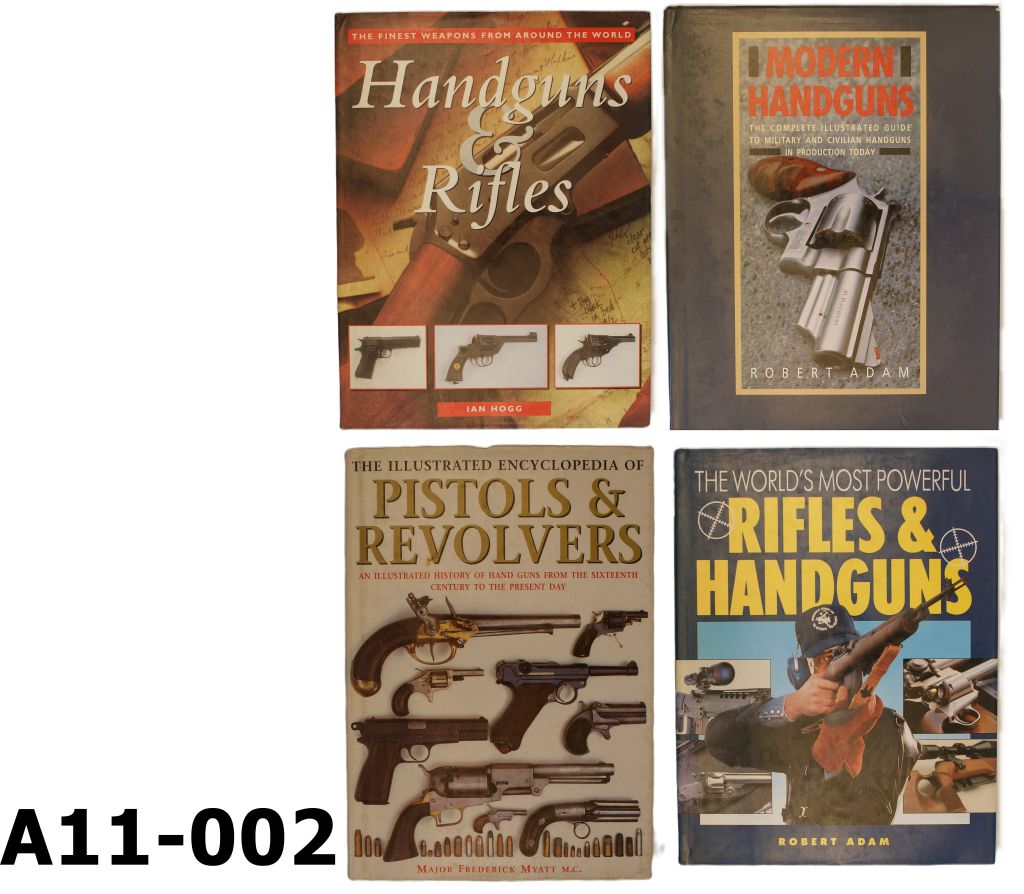 1) “The World’s Most Powerful Rifles & Handguns” by Robert Adam. Hard cover, illustrated, 128 pages. Good condition. 2) “Modern Handguns” by Robert Adam. The complete illustated guide to military and civilian handguns in production today. Hard cover, illustrated, 127 pages. Good condition. 3) “The Illustrated Encyclopedia of Pistols & Revolvers” by Major Frederick Myatt M.C. An illustrated history of hand guns from the sixteenth century to the present day. Hard cover, illustrated, 207 pages. Good condition. 4) “Handguns & Rifles” by Ian Hogg. The finest weapons from around the world. Hard cover, illustrated, 128 pages. Good condition.