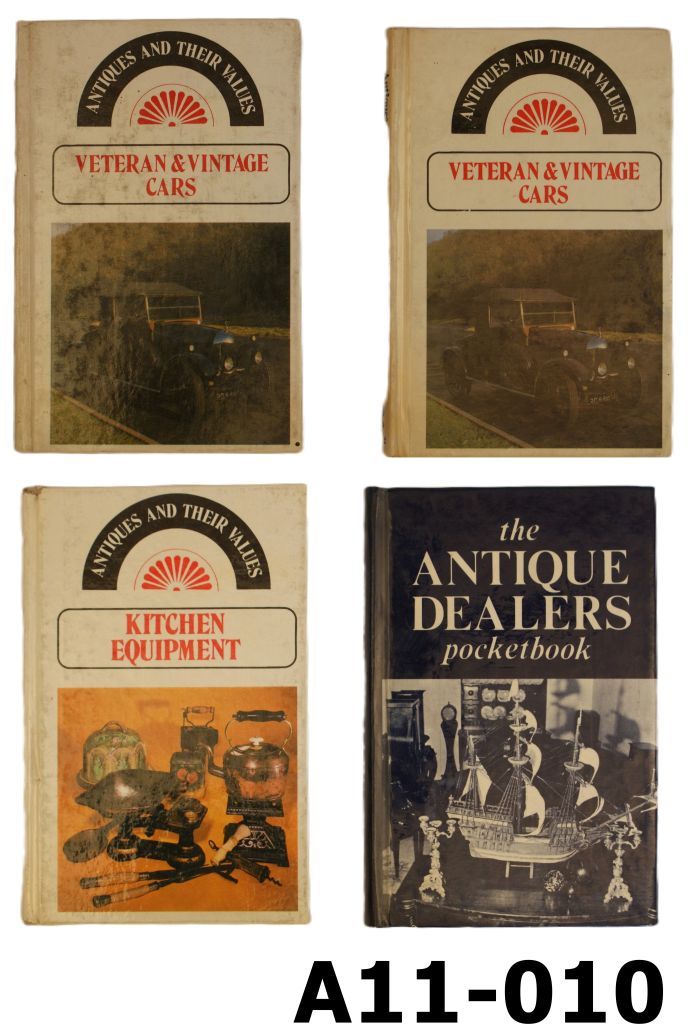 1.The Antiques and their values – Veteran & Vintage cars x 2 books. 2. The Antiques Dealers Pocketbook. 3. The Antiques and their values- kitchen equipment.