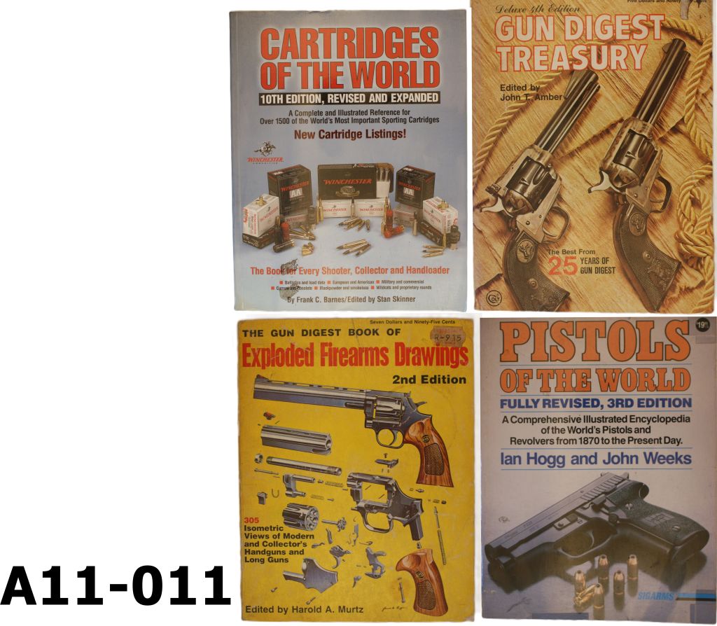 1) Cartridges of the world 10th edition, revised and explained by Frank C. Barnes. 2) The gun digest book of Exploded Firearms Drawings. 2nd Edition by H.A Murtz 3) Pistols of the world, 3rd edition Ian Hogg & John Weeks. 4) Gun Digest Treasury, deluxe 4th edition, by John T Amber.