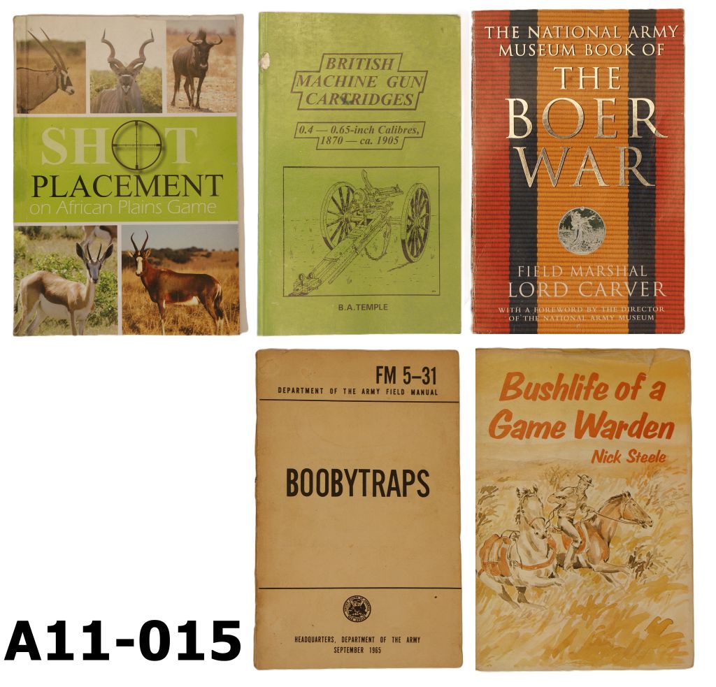 1) British machine gun cartridges by B A Temple. Paperback book, 117 pages, good condition. 2) Boobytraps, USA Army HQ, paperbak (spine broken) 136 pages, fair condition. 3) Bushlife of a game warden by N Steele, hard cover, 230 pages, good condition. 4) Shot placement on African plains game. Softcover, 99 pages, good condition. 5) The Boer War by Field marshal Carver, soft cover, 299 pages, good condition.