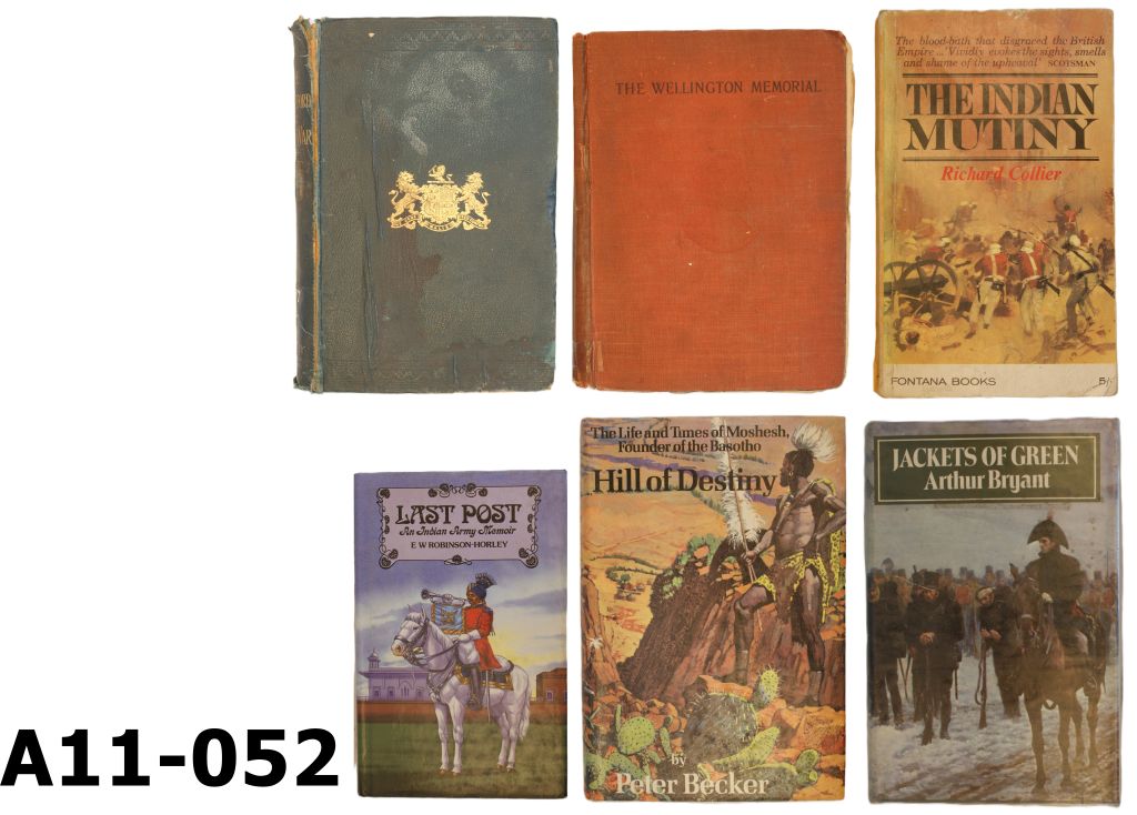 1) Hill Of Destiny by Peter Becker. Hard cover, illustrated, 294 pages. 2) With Lord Stratford In The Crimean War by James Henry Skene. Hard cover, 352 pages. 3) The Wellington Memorial by Major Arthur Griffiths. Hard cover, illustrated, 358 pages. 4) Jackets of Green by Arthur Bryant. Hard cover, illustrated, 478 pages. 5) Last Post by E W Robinson-Horley. Hard cover, 178 pages. 6) The Indian Mutiny by Richard Collier. Soft cover, illustrated, 349 pages.