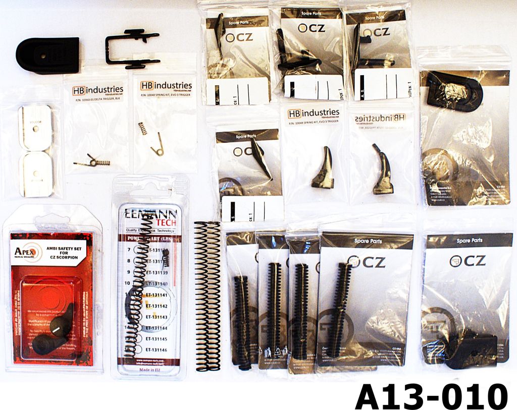 CZ P07: Triggers x 2; extractors x 2; slide stop x 2; recoil spring set x 4; magazine bottom plates x 3 as well as CZ75 recoil springs x 3; trigger spring kit x 1; magazine bottom plate (Sil IDPA) x 2 and CZ Scorpion Evo3 trigger spring sets x 2; ambi safety set x 1.