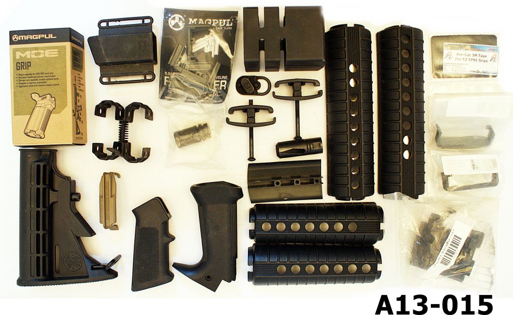 Replacement stock and handguards, various pistol grips, various magazine connectors and magazine followers.