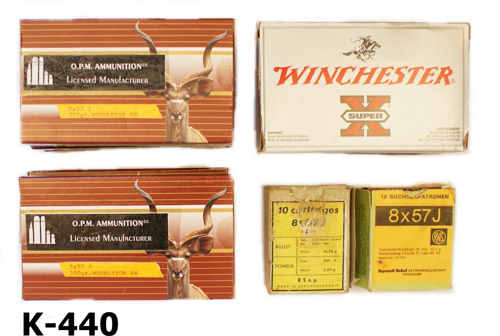 8x57JS Winchester 170gr. Power-Point x 40, 8x57J OPM 200gr. RN Woodleigh bullet x 120, 8x57J RWS Teelmantel x 10, 8x57J BS SP x 10.