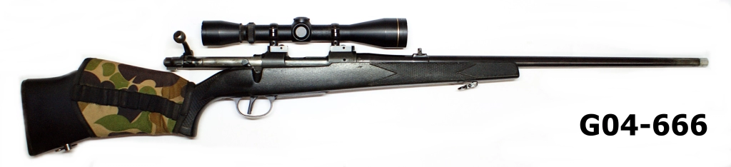 Rifle has a black synthetic monte-carlo styled stock & cheek-piece type detachable ammo pouch. Muzzle of 24″(609.6mm) barrel is threaded for suppressor and a muzzle cap fitted. Some wear to blued finish on muzzle area and to magazine floorplate. Scope removed. Good overall condition.