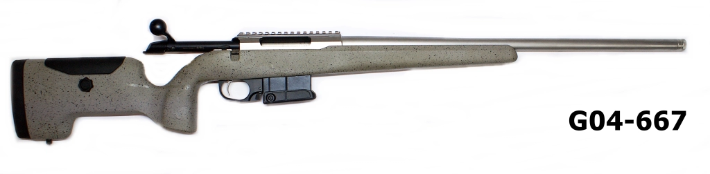 Matt stainless finish to 24″(609.6mm) barrel which is threaded for a suppressor and receiver which is equipped with a tactical rail mount. Extended ten round magazine, dappled grey synthetic stock with adjustable cheekpiece. Rifle is reputedly unfired and in mint condition.