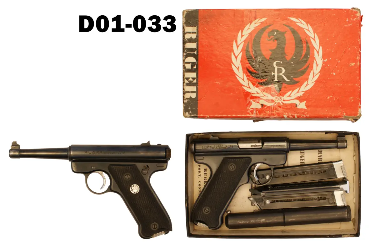 100-D01-033 .22lr Ruger MK1 Standard 4,75″ Pistol – Boxed, Suppresor & 3 x Magazines