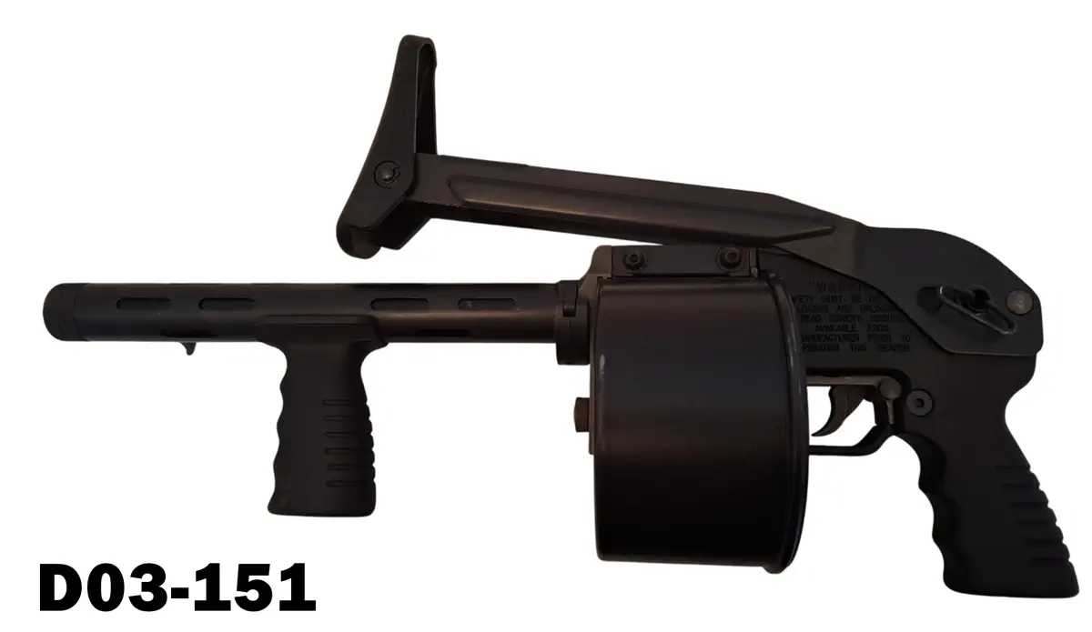 Designed and developed in Rhodesia and subsquently manufactured by Aserma, a division of Reutech Defence Industries, this is a combat shotgun with folding stock, a very short overall length of 19,68″ (500mm) with stock folded and twelve round drum magazine. Approximately 600 to 700 units were produced. Good plus condition. (Start Bid : R2500 Hi Estimate: R4500)