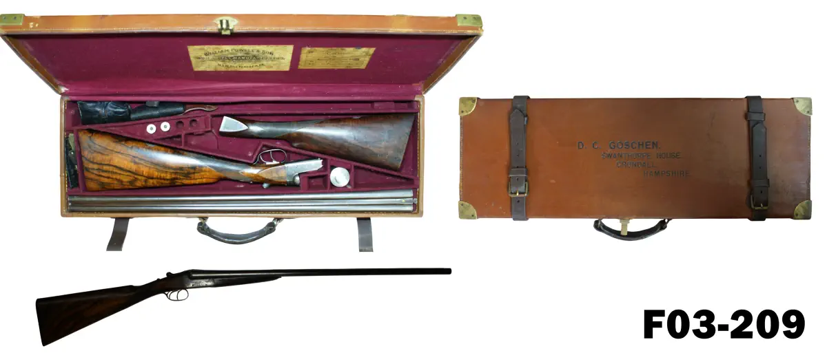 In brass cornered leather case with “William Powell & Son” plus charge label no.2 of a pair of guns. Nitro-proofed Damscus 28″ (711,20mm) barrels marked to “William Powell & Son, 35, Carrs Lane, Birmingham”. “No.2″ marking to breech area. Very good bores. Shotgun is supplied with two stocks, the original which has a 14,5″ L.O.P and a very well-figured professional replacement which has a long 16” L.O.P which the present owner required. Action has a colour case-hardened finish and features extensive scroll engraving. Accessories include a set of snap-caps, “William Powell” marked oil bottle and two leather cleaning kit holders. Tight action, good bores, all in excellent condition. (Start Bid : R35000 Hi Estimate: R50000)