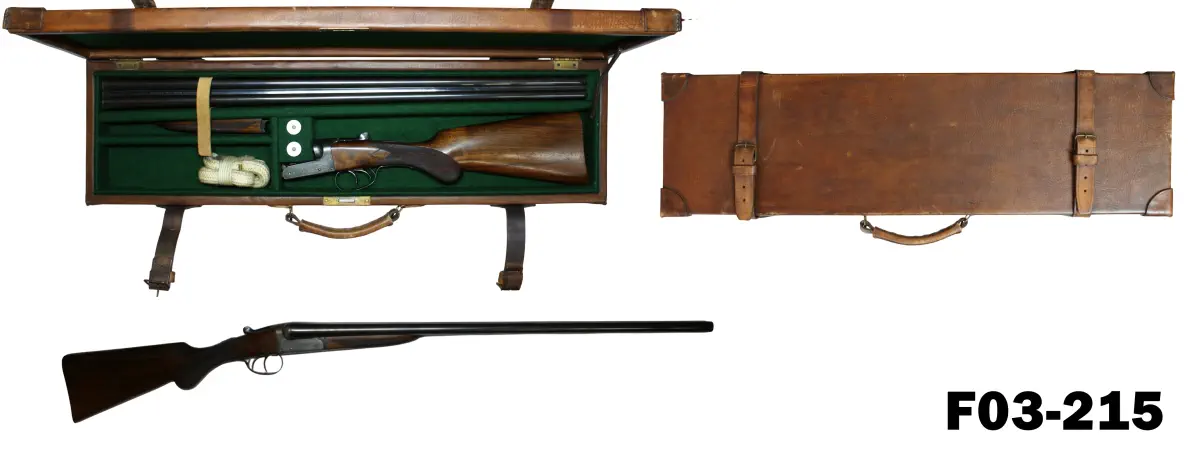 In hard leather case in good condition. Nitro-proofed barrels of 29,75″ (755,65mm) choked full and 1/4. Extractor gun. Pistol grip styled stock with a 15″ L.O.P. Good bores, tight action good plus overall condition. (Start Bid : R3750 Hi Estimate: R5500)