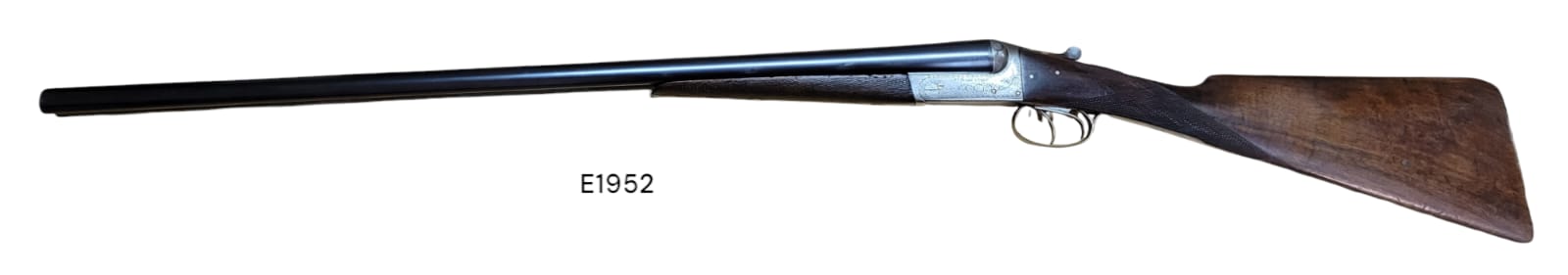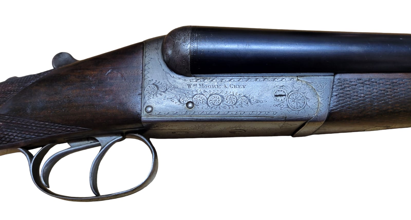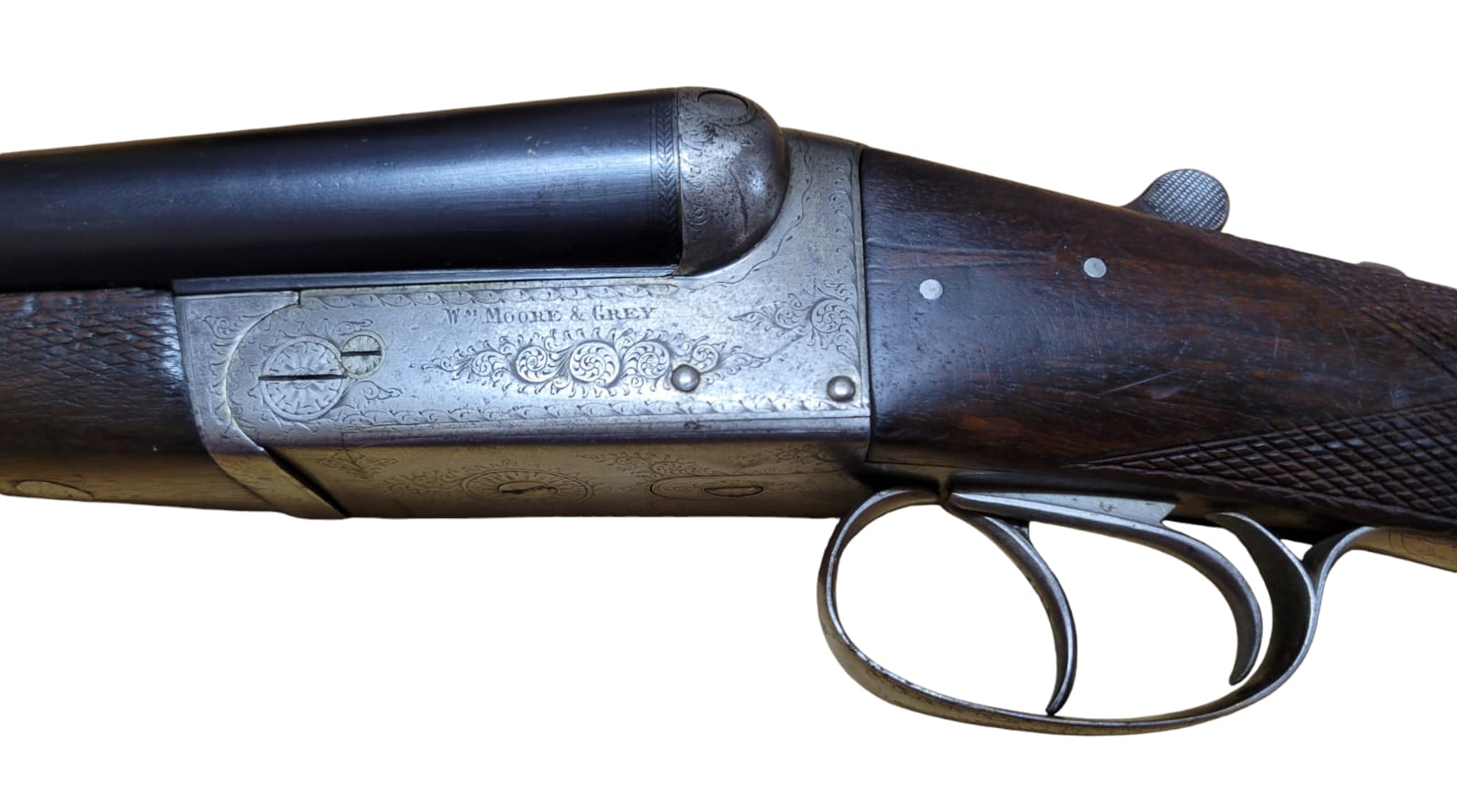 12GA Moore & Grey S/S Shotgun. Box Lock, N.E., D.T. 30″ Barrel with 1/2 & 1/4 Choke. Good bore with some pitting. Overall fairly good condition.