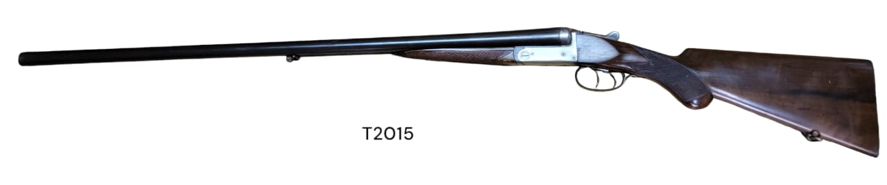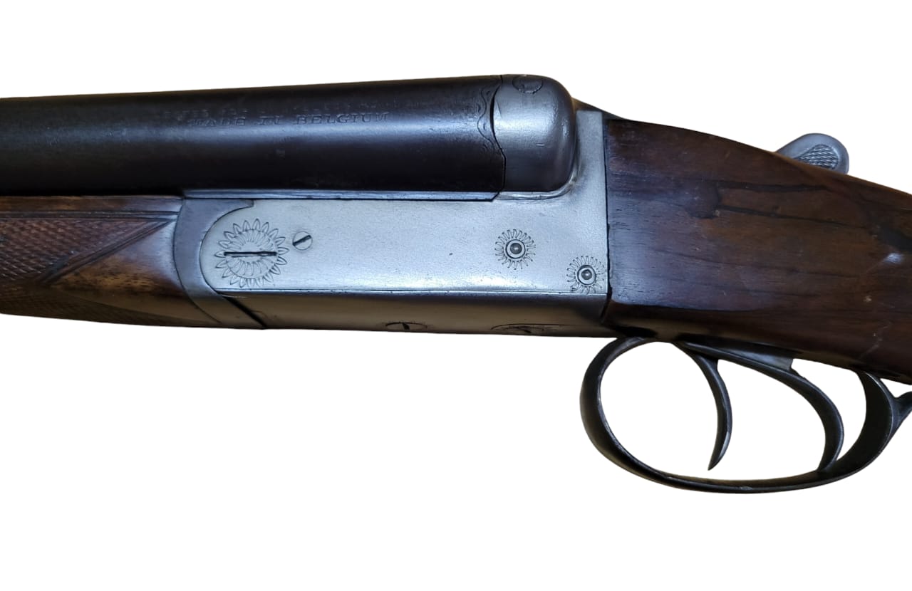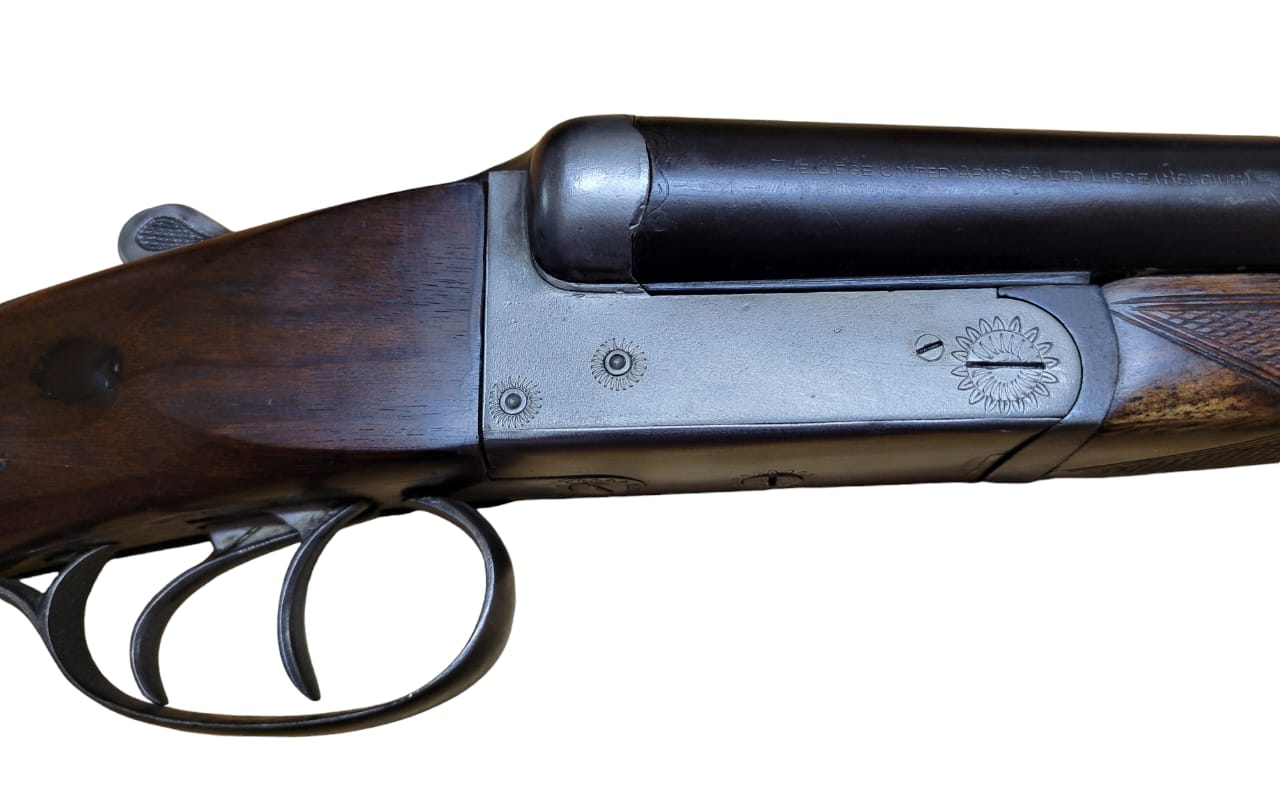 12GA The Liege United Arms S/S Shotgun. Box Lock, N.E., D.T. 30″ Barrel with Full & 1/2 Choke. Good bore with light pitting and dent in left barrel. Overall fair condition.