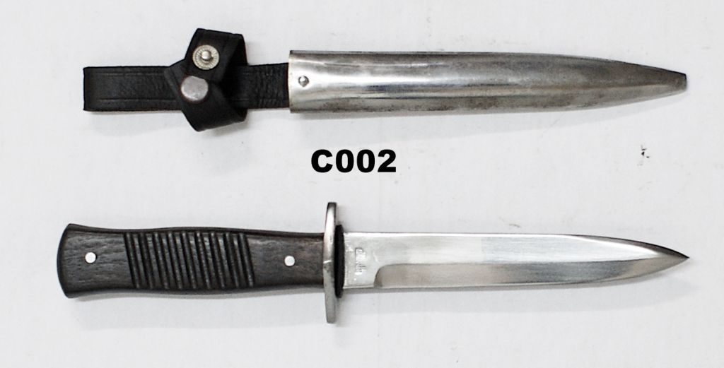 Flat white plastic grips, left facing eagles head to handle. Blade marked to “F. W. H. O. Leer Berlin”. Suspect this is a good repro rather than original as a originals had mother-of-pearl handles to them.