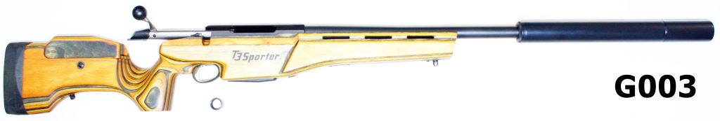 With adjustable factory laminated stock labelled “T3 Sporter”. Reflex type suppressor fitted to 24″ barrel. Detachable 5 round magazine. Tactical/sling swivel type rail fitted to side & bottom of fore-end. Oversized bolt handle for easy grasping. Mint condition. New barrel.