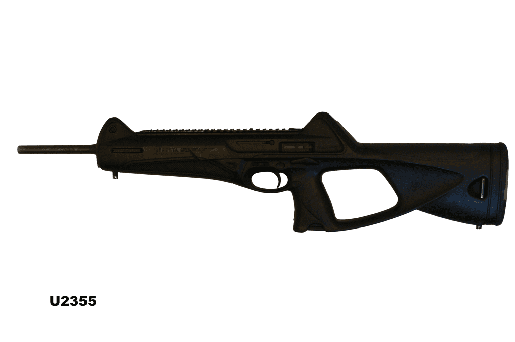 Tactical carbine with polymer thumbhole styled stock and tactical rail designed to fire both the 18 and 32 round Beretta pistol magazines. Frame: shows some noticeable carry wear.