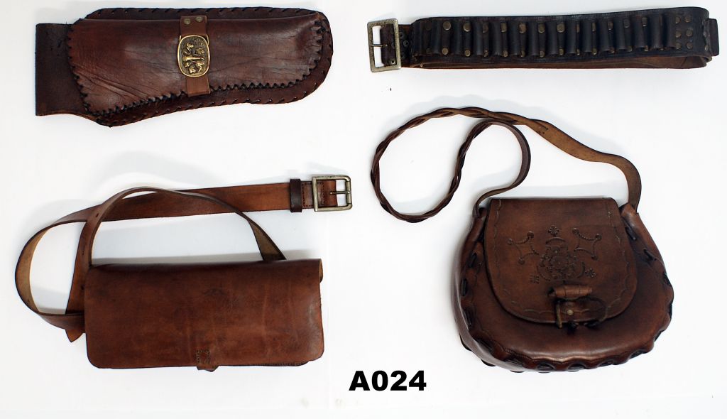 2) A custom-made leather single action revolver holster. A good custom-made ammo pouch and belt for the Martini-henry or Snider cartridges holding 20 x cartridges in a fashioned wooden block. 3) A center-fire rifle cartridge belt.