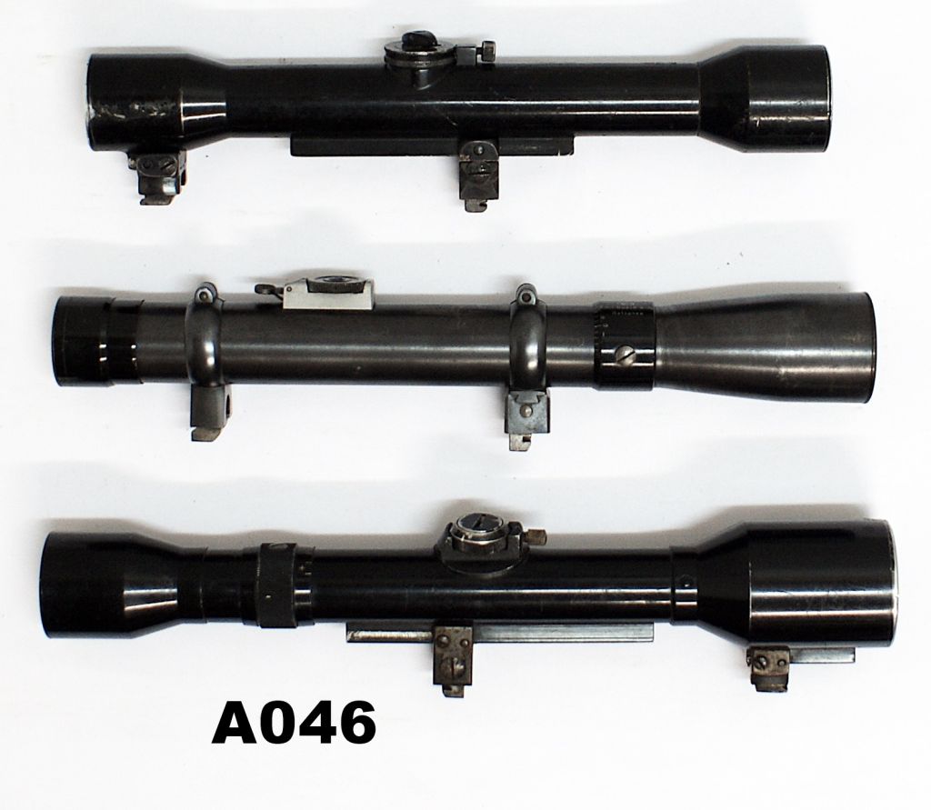 3) “Visar 4,5X D.R.G.M by Emil Bush A-G Rathenow” with windage adjustable rings. Slight “sag” to horizontal line of reticle, otherwise good. All three of the above scopes have claw mounts which would be suitable for original Mauser sporting rifles.