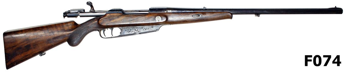 Built on split bridge Mannlicher type action with protruding clip loaded magazine box. Octagonal barrel of 24.5″. Engraved action and magazine box. spoon handle bolt. Double set trigger. Edward Kettner Koln. Rather attractive overall condition. Fair bore.