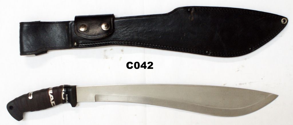 A “Blackjack Knives Japan Marauder Mk11″ machete with a dark brown leather bound handle in a black leather sheath, 54cm. Bolo type blade with a length of 14,75”. Excellent condition.
