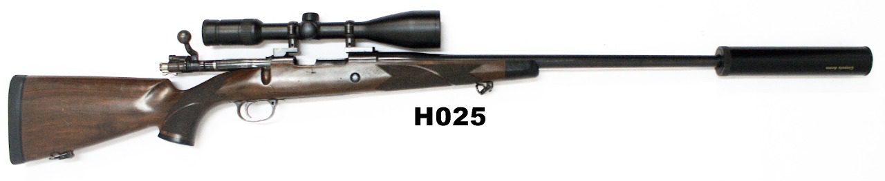 Fitted with Swarovski Z3 4-12×50 scope and suppressor. One of the Ermelo made M98 Mauser action rifles with lo-scope safety and adjustable trigger. Wrap-around chequering to wrist & fore-end. Dark wood grip cap & fore-end tip. Good original condition.